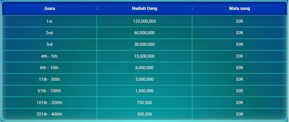 2. Total Hadiah Event ini adalah sebesar Rp 8.560.500.000 yang akan dibagikan kepada seluruh pemenang Tournamen